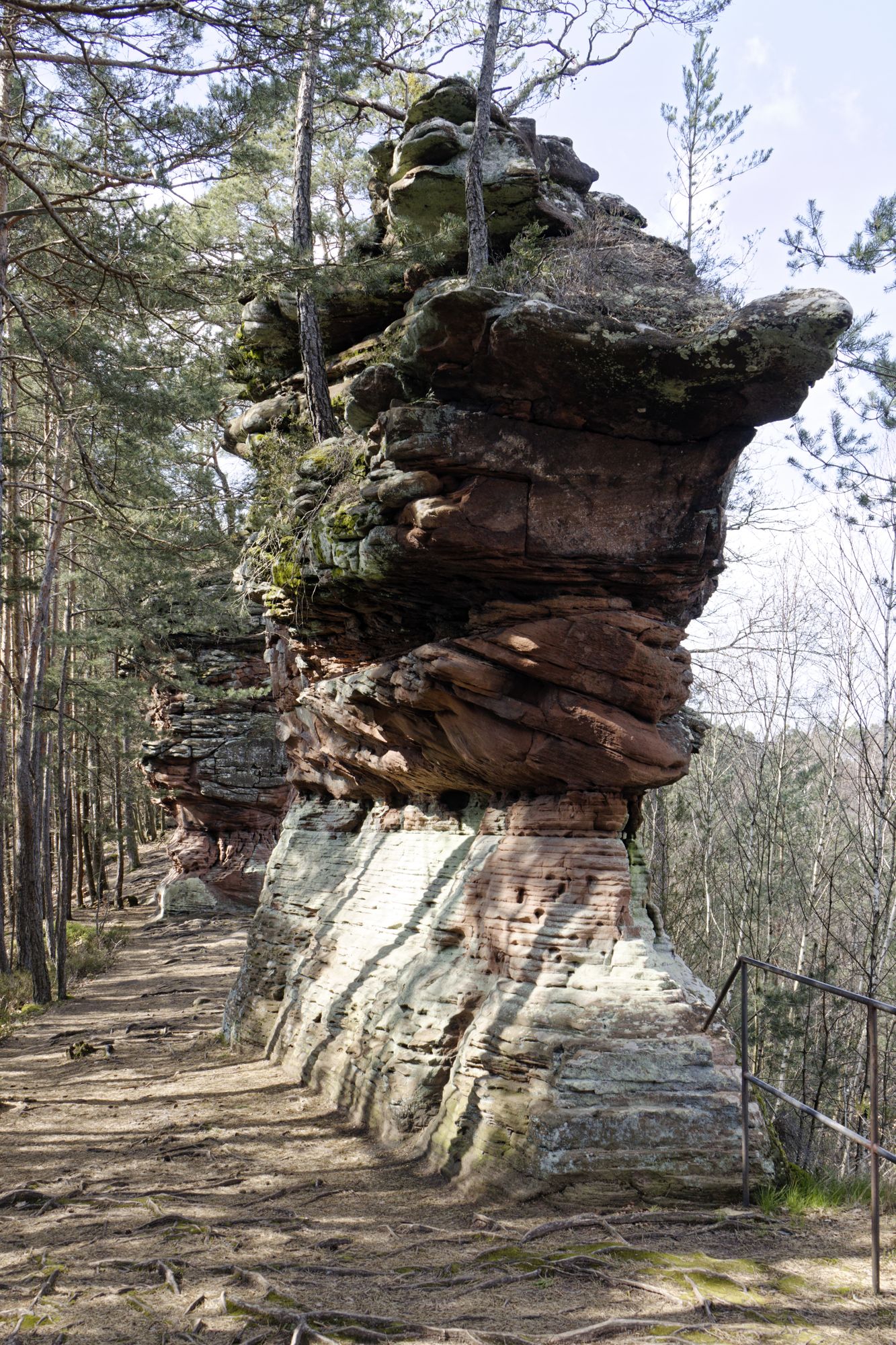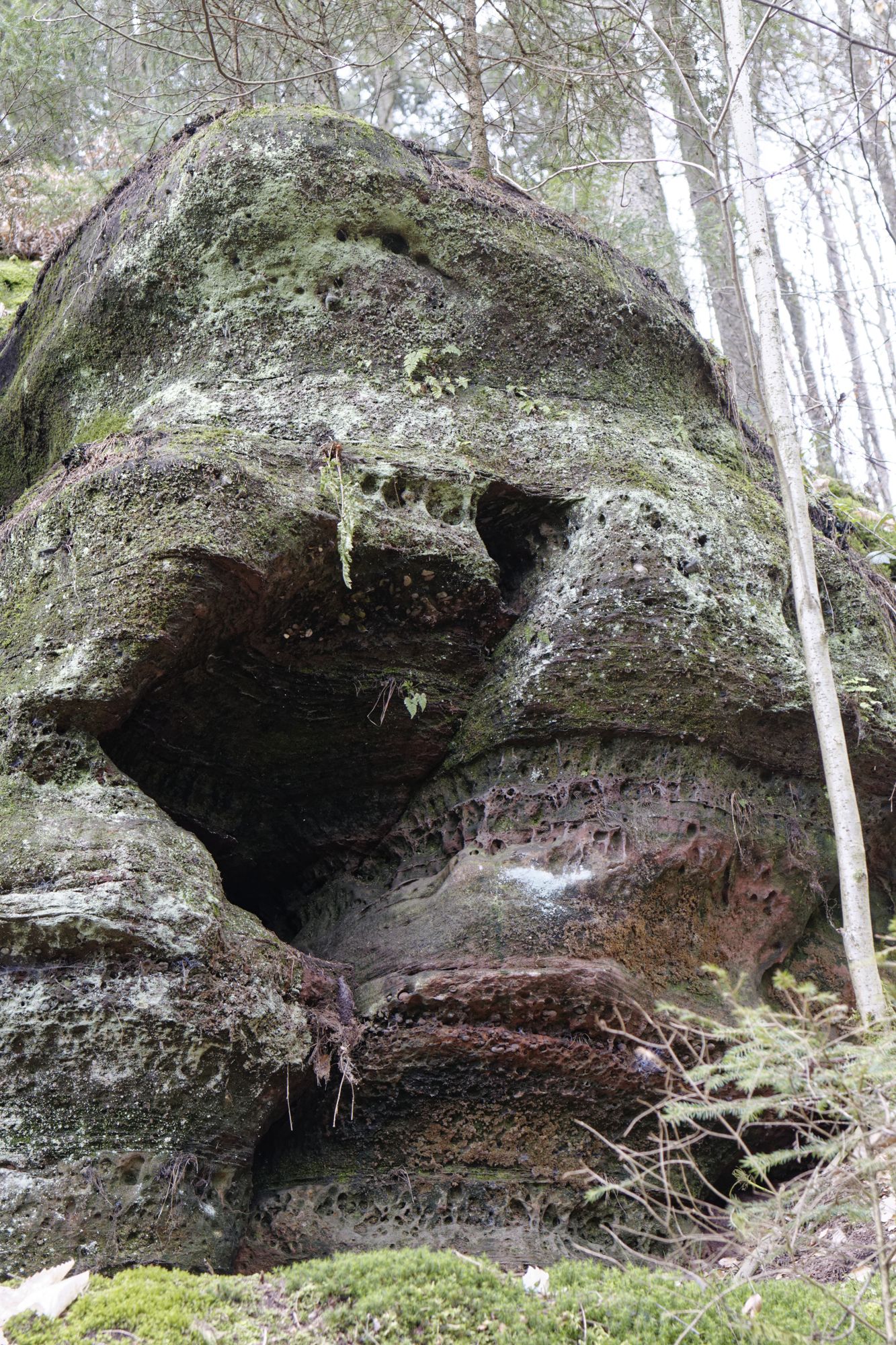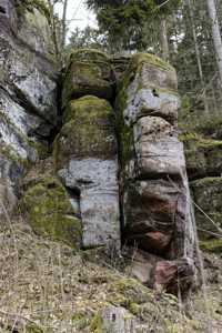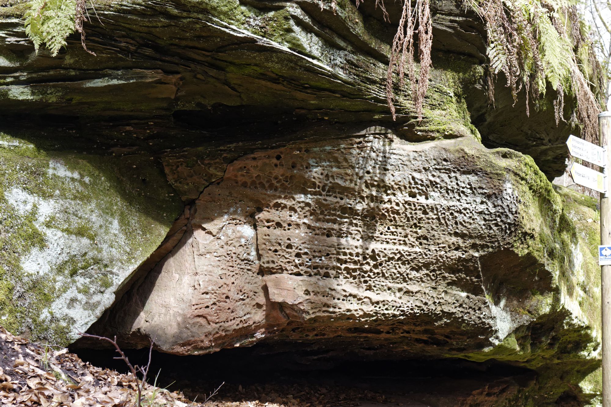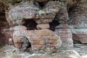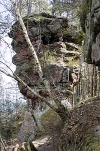 Der rosa-orangene Sandstein ist typisch für die Pfalz. An einigen Stellen treten sie als Skulpturen auf! Obere und untere Bärenhöhle in Rodalben: Pano