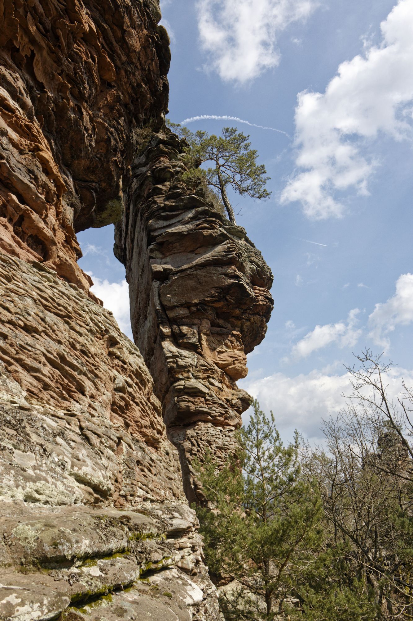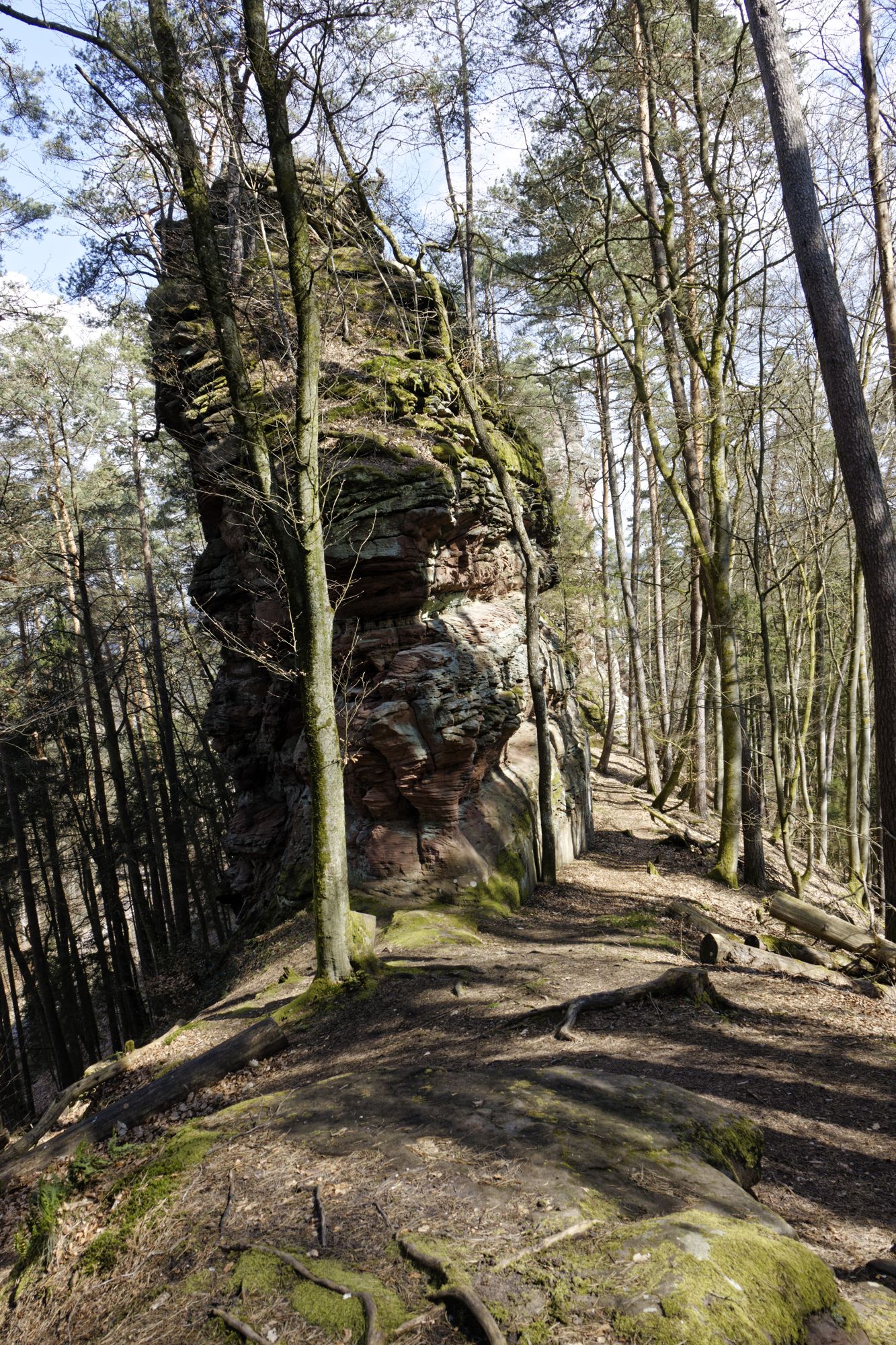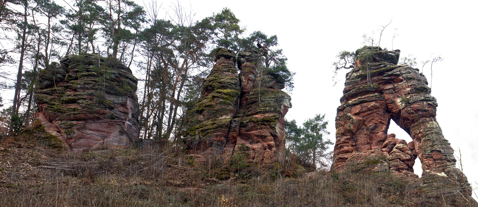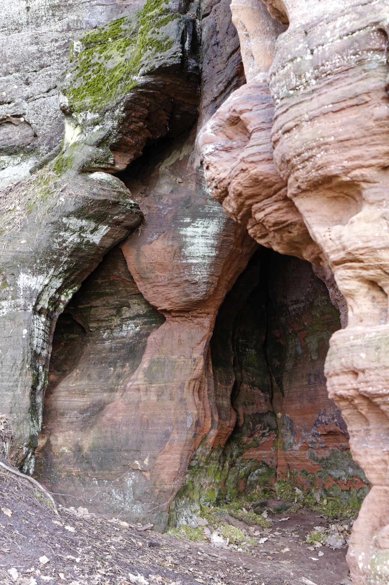 Der rosa-orangene Sandstein ist typisch für die Pfalz. An einigen Stellen treten sie als Skulpturen auf! Obere und untere Bärenhöhle in Rodalben: Pano